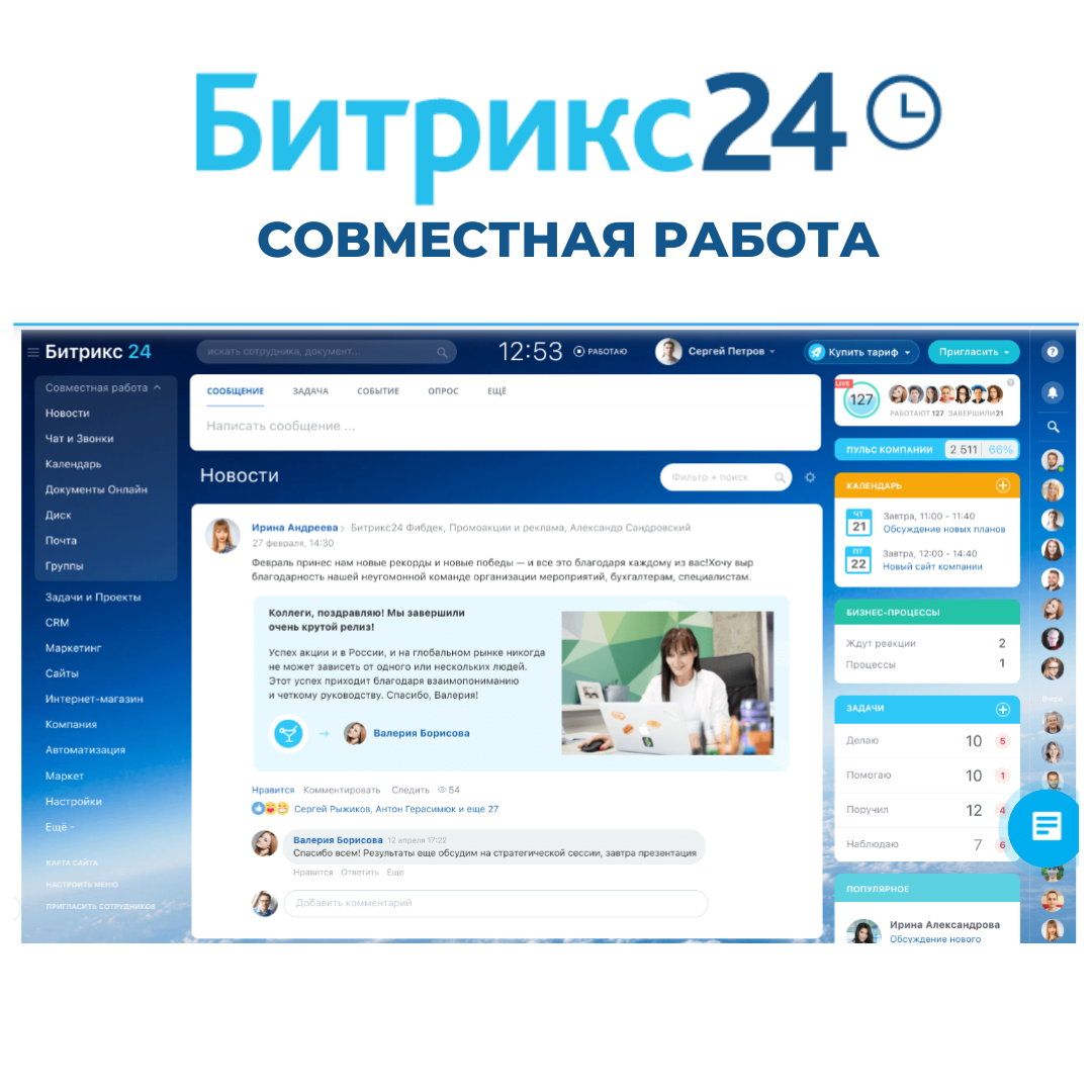Битрикс24.Совместная работа позволяет повысить удобство и качество совместной работы всей компании: общение в чатах, видеозвонки и онлайн-совещания с участием 48 человек, быстрое оповещение о новостях всех сотрудников компании, планирование рабочего дня и встреч с любого устройства, фиксация начала и конца рабочего дня, формирование рабочих отчетов
